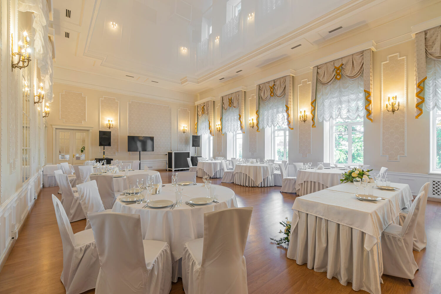 У нас есть вся необходимая аппаратура для проведения мероприятия: профессиональное световое и звуковое оборудование, плазменные панели или экран и проектор для трансляции видео.