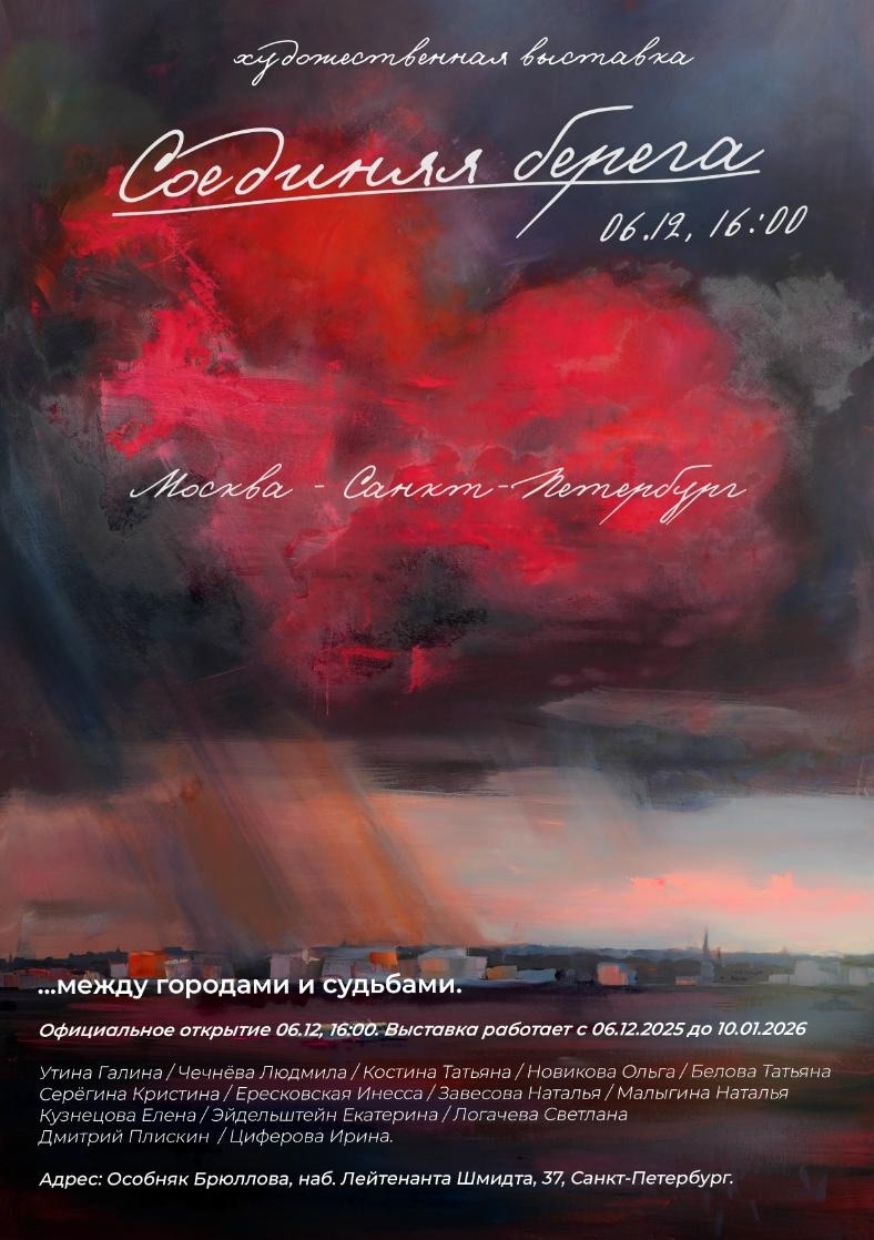 6 декабря в Особняке А. П. Брюллова откроется выставка московских художников «Соединяя берега» — масштабный проект, объединяющий четырнадцать авторов творческой мастерской «Арт-убежище».