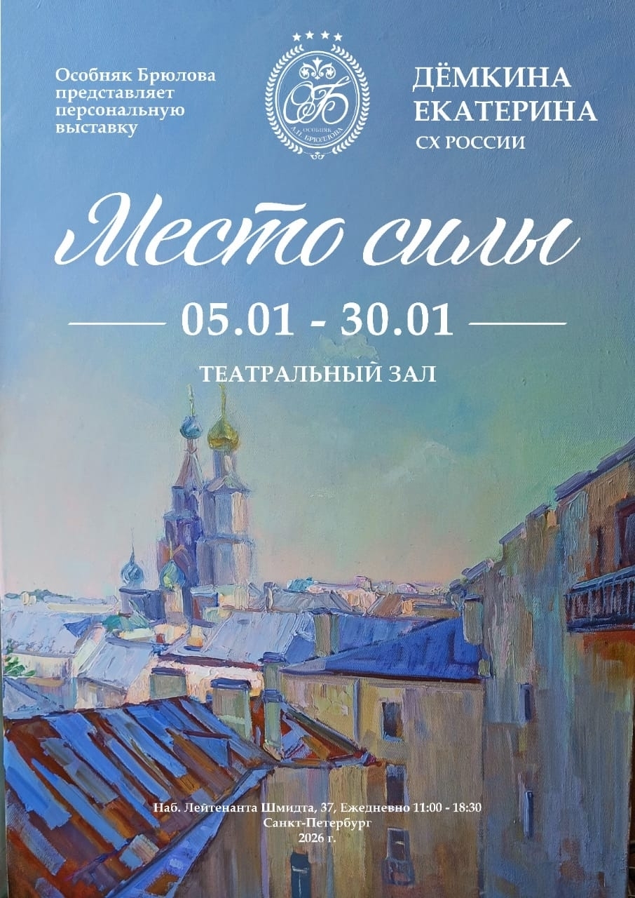 С 5 января по 30 января 2026 года в исторических интерьерах Особняка Брюллова в Санкт-Петербурге пройдет персональная выставка современной художницы Екатерины Дёмкиной — «Место силы».
